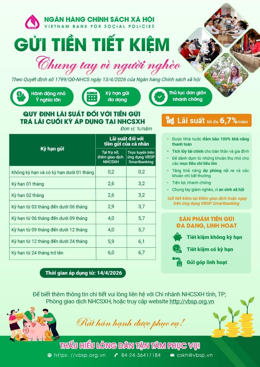 Thực hiện Quyết định số 364/QĐ-NHCS ngày 13/04/2026 của Giám đốc chi nhánh Ngân hàng Chính sách xã hội tỉnh Điện Biên về việc quy định lãi suất tối đa đối với tiền gửi bằng đồng Việt Nam của tổ chức, cá nhân tại chi nhánh Ngân hàng Chính sách xã hội tỉnh Điện Biên.